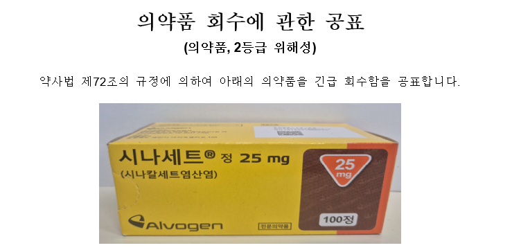 다. 회수 사유 : 불순물(N-nitroso-cinacalcet) 초과 검출에 따른 사전예방적 조치로 시중 유통품에 대해 영업자 회수